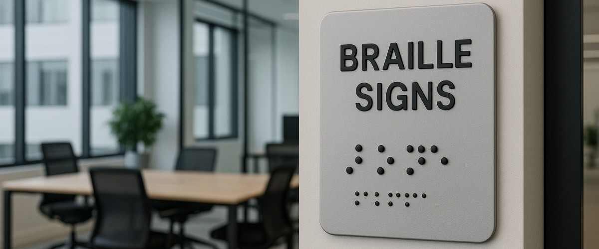 Custom Braille signs are tactile signs that include raised lettering and Braille dots, making them accessible for people who are blind or visually impaired. They are often required in public buildings to meet accessibility standards.